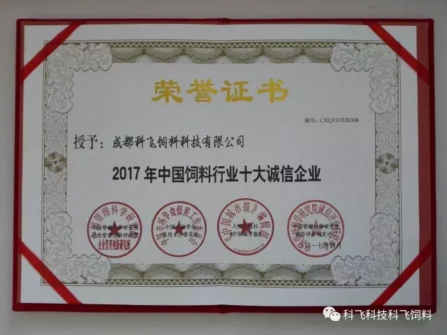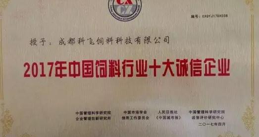 熱烈祝賀成都科(kē)飛飼料科技有(yǒu)限公司榮獲“2017年中國飼料行業十大誠信企業”的稱號。